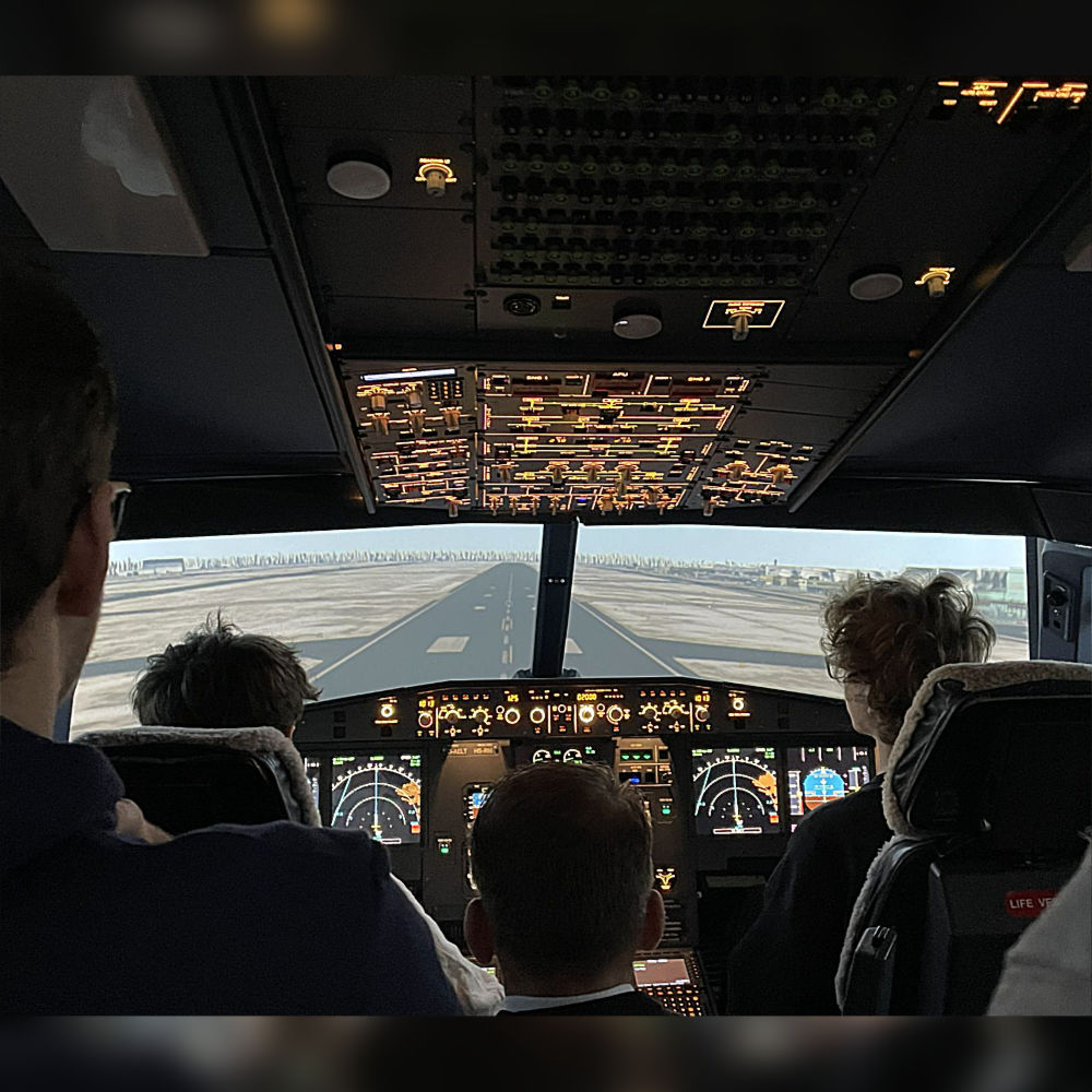 „Wir haben am 09.02.2026 die Hochschule RheinMain besucht und einen Einblick in den Campus und das Studium bekommen. In verschiedenen Vorträgen wurden Studiengänge und Forschungsprojekte spannend vorgestellt. Besonders spannend war der Besuch des Wasserstofflabors, der Flug im A320 Simulator und der Austausch mit Studierenden.