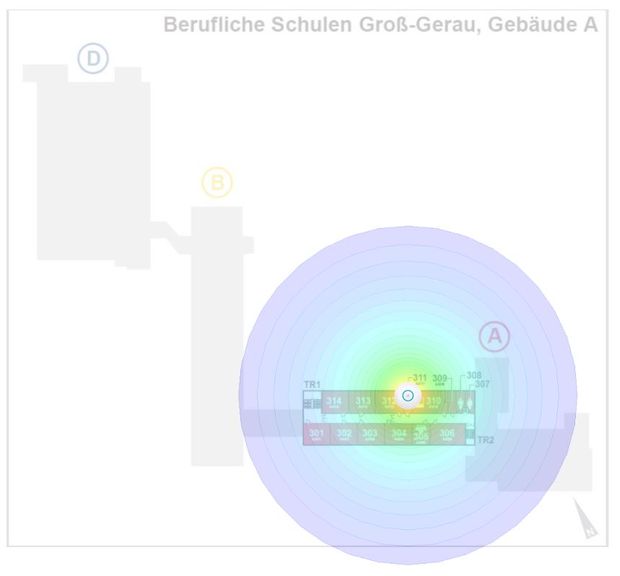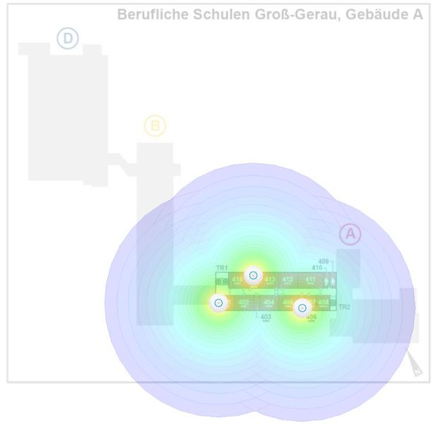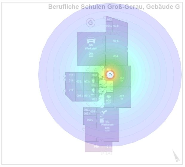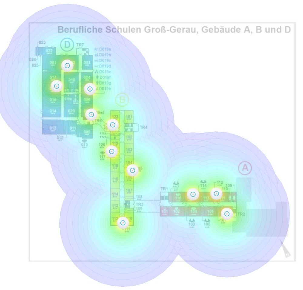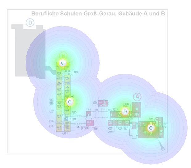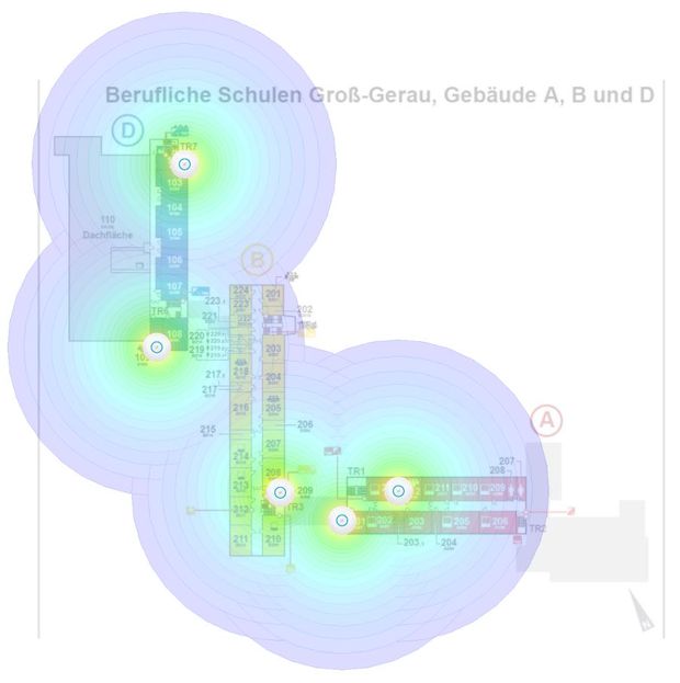 Das schuleigene WLAN erfasst alle Schulräume auf dem Campus der Beruflichen Schulen Groß-Gerau. Alle schuleigenen und WLAN-fähigen Geräte können sich in das WLAN einbuchen und werden so mit einem Internetzugang versorgt.