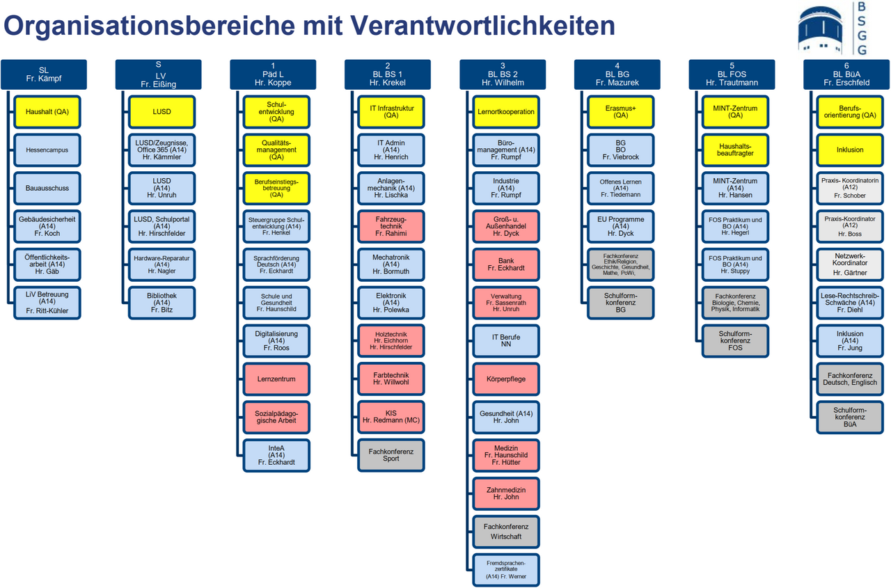 Die Steuerung und die Koordination aller Qualitätsprozesse findet in der Steuergruppe der BSGG statt. Die Steuergruppen-Sitzungen finden einmal im Monat statt, hieran nehmen der Schulleiter und die Qualitäts-beauftragten teil. Außerdem ist aus jedem Bereich mindestens ein Vertreter vorhanden.
